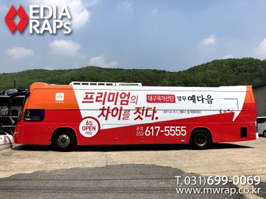 버스 대구국가산단 영무예다음 [작업차량] BH120F 대형버스[차량색상] 화이트&레드[랩핑타입] 전체랩핑 ..