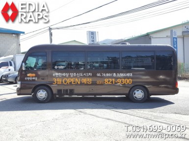 버스 양주이편한세상 [작업차량] 25인승 카운티[차량색상] 베이지&그레이 투톤[랩핑타입] 풀랩핑(지붕포함)..