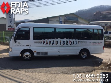 버스 파라다이스시티(1호) [작업차량] 25인승 카운티[차량색상] 베이지&그레이 투톤[랩핑타입] 부분랩핑..