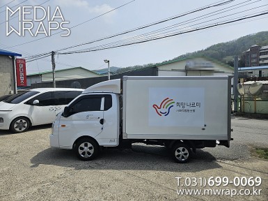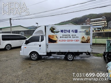 탑차·트럭 복만네식품 [작업차량] 1톤탑차[차량색상] 흰색[랩핑타입] 2면 전체랩핑 ..