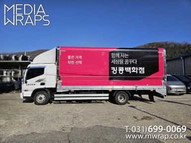 탑차·트럭 킹콩백화점 [작업차량] 5톤윙바디탑차[차량색상] 화이트[랩핑타입] 탑3면 전체랩핑 ..